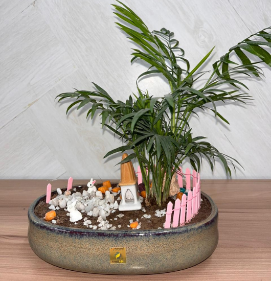 This is a large planter beautifully designed with the mini garden theme, with decorative elements to make it attractive to the eye. The palm is planted in a wide, high quality ceramic pot that ensures stability, style, and gives the palm enough space to grow healthily. The size-wise and luxurious design makes it ideal to place in the living room, office, bedroom, reception, or to gift.